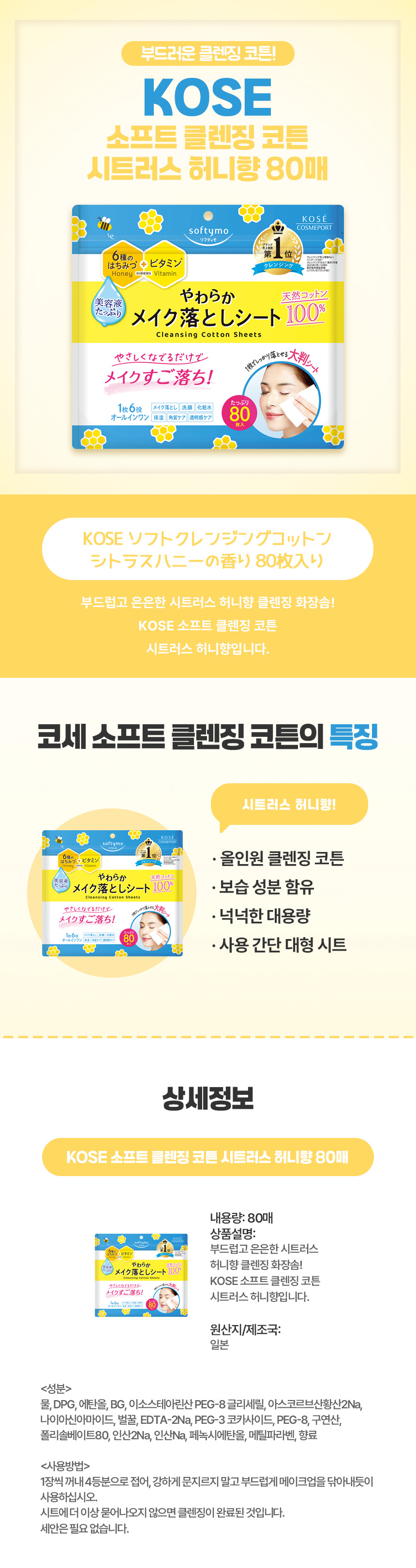 KOSE 소프트 클렌징 코튼 시트러스 허니향 80매