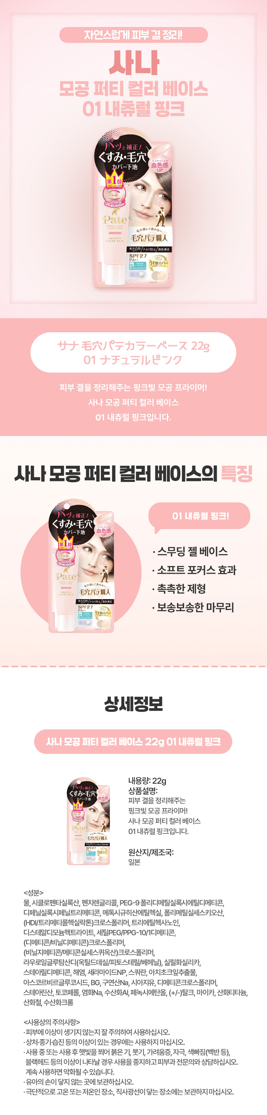 사나 모공 퍼티 컬러 베이스 22g 01 내츄럴 핑크