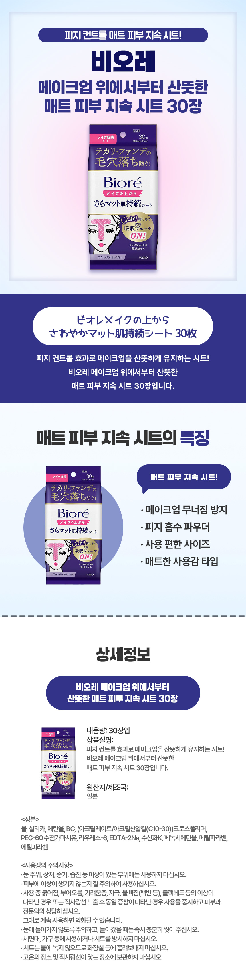 비오레 메이크업 위에서부터 산뜻한 매트 피부 지속 시트 30장