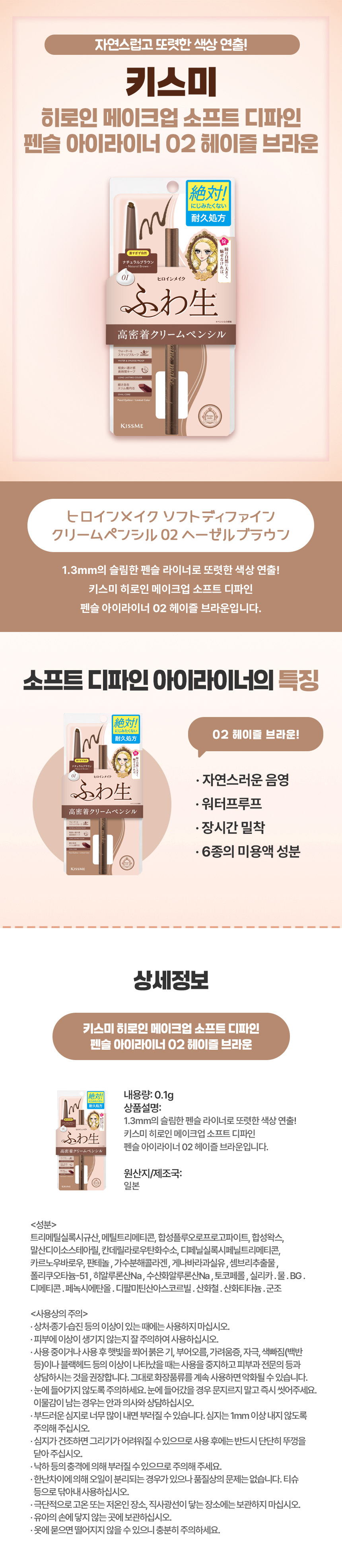 따뜻한 감각적 눈매엔, 일본 직구 키스미 히로인 메이크업 소프트 디파인 펜슬 아이라이너 02 헤이즐 브라운