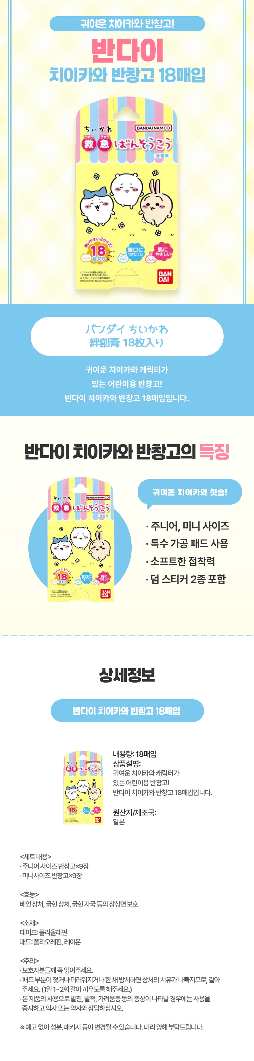상처에도 포근히 붙여주는, 일본 직구 반다이 치이카와 반창고 18매입