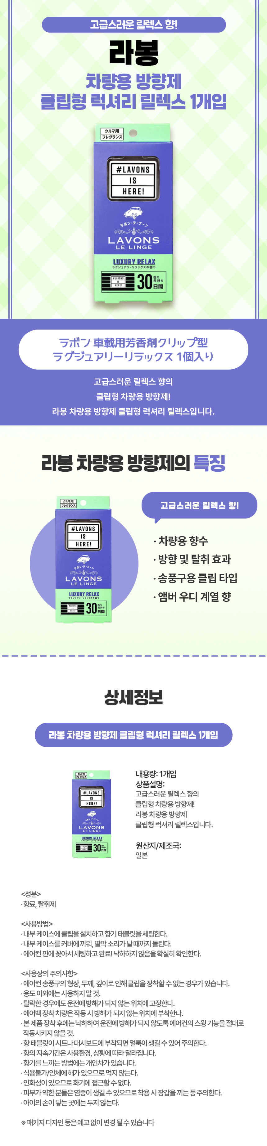 고급스러운 향기로 편안한 드라이브, 일본 직구 라봉 차량용 방향제 클립형 럭셔리 릴랙스