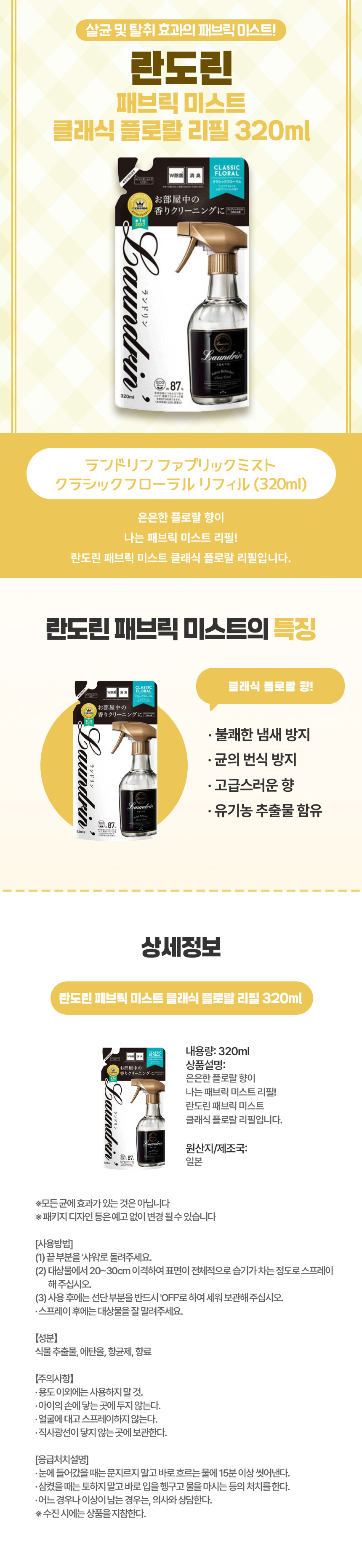 고급스러운 클래식 플로랄 일본 직구 란도린 패브릭 미스트 리필