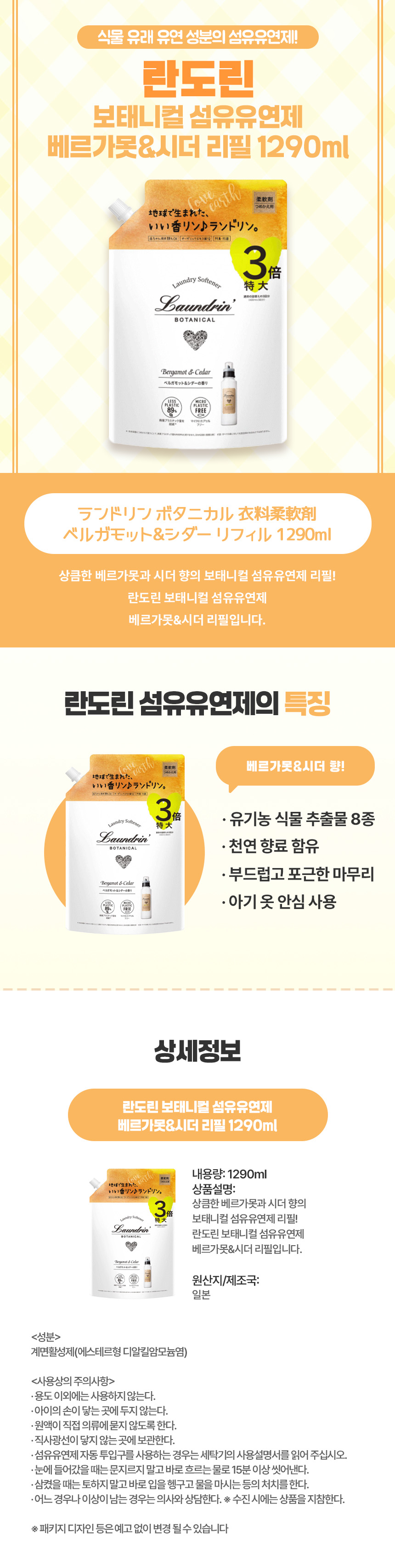자연스러운 향이 오래가는 일본 직구 란도린 보태니컬 베르가못&시더 섬유유연제 리필