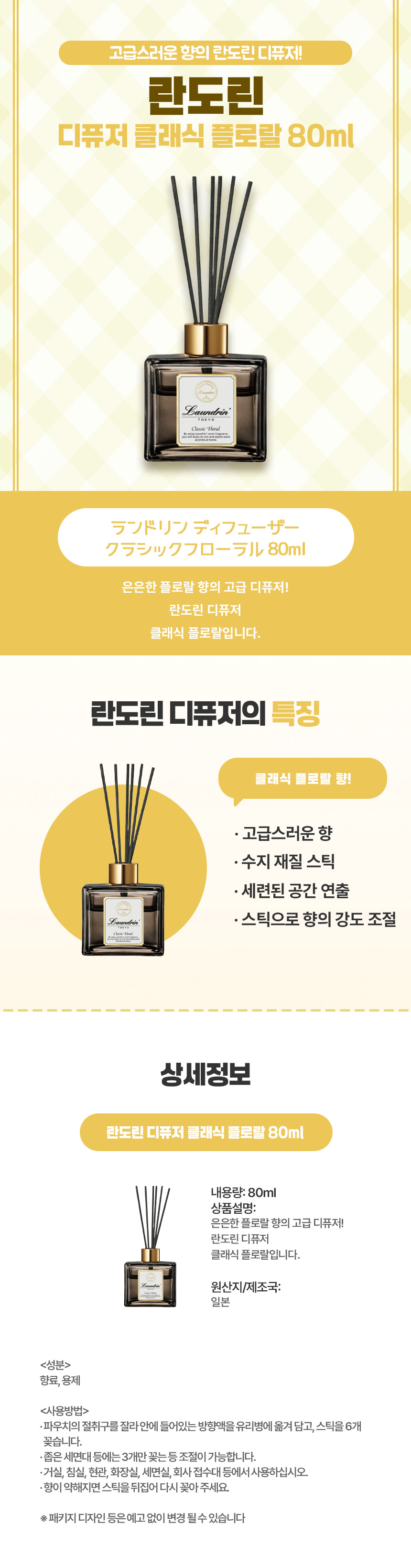 우아한 플로랄 향이 담긴 일본 직구 란도린 클래식 플로랄 디퓨저 본품