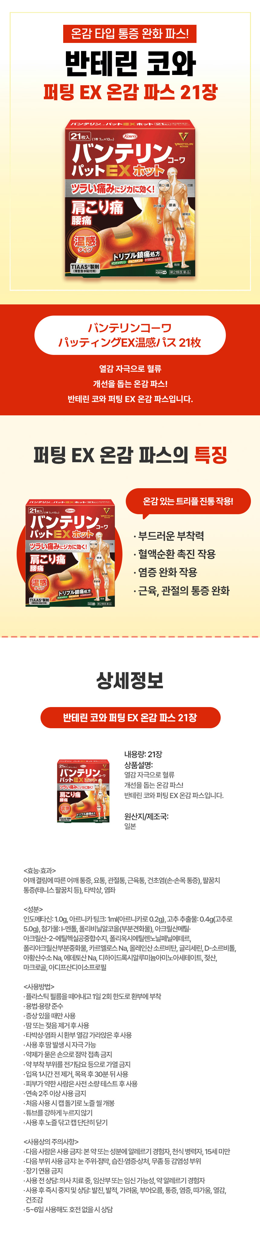 넓은 부위 온열 파스, 일본 직구 반테린 코와 퍼팅 EX 온감 파스