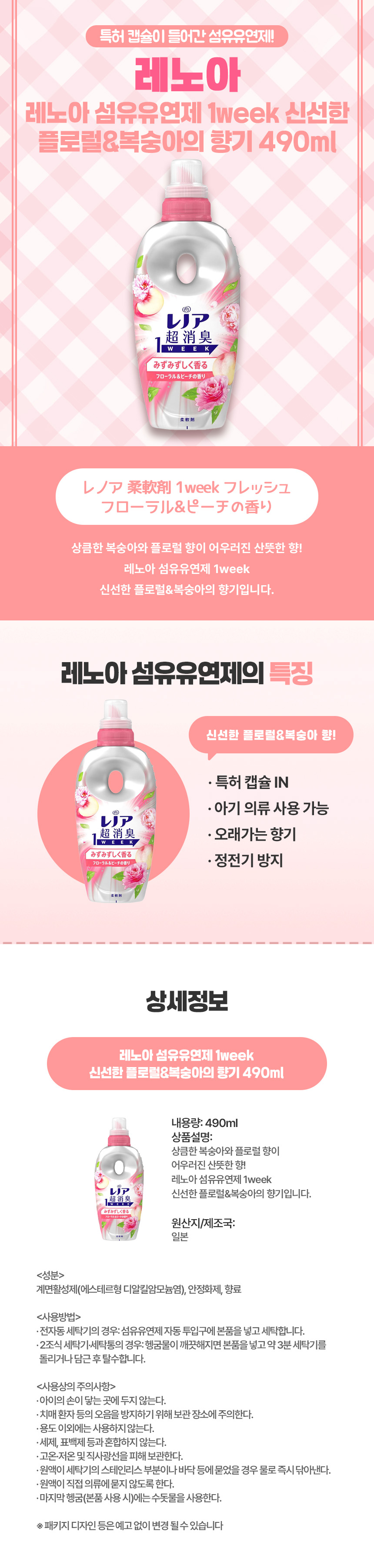 레노아 섬유유연제 1week 신선한 플로럴&복숭아의 향기 490ml
