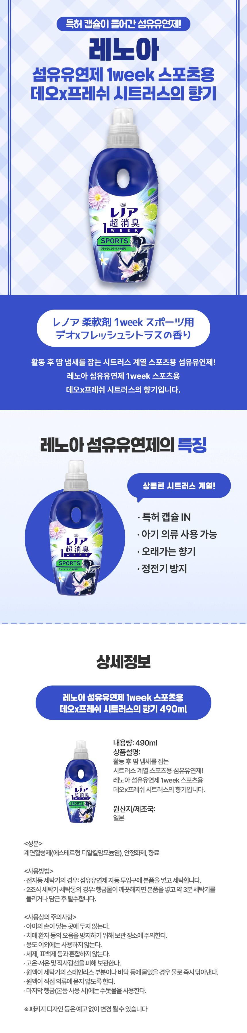 운동 후에도 상쾌한 시트러스 향, 일본 직구 레노아 1week 스포츠용 섬유유연제