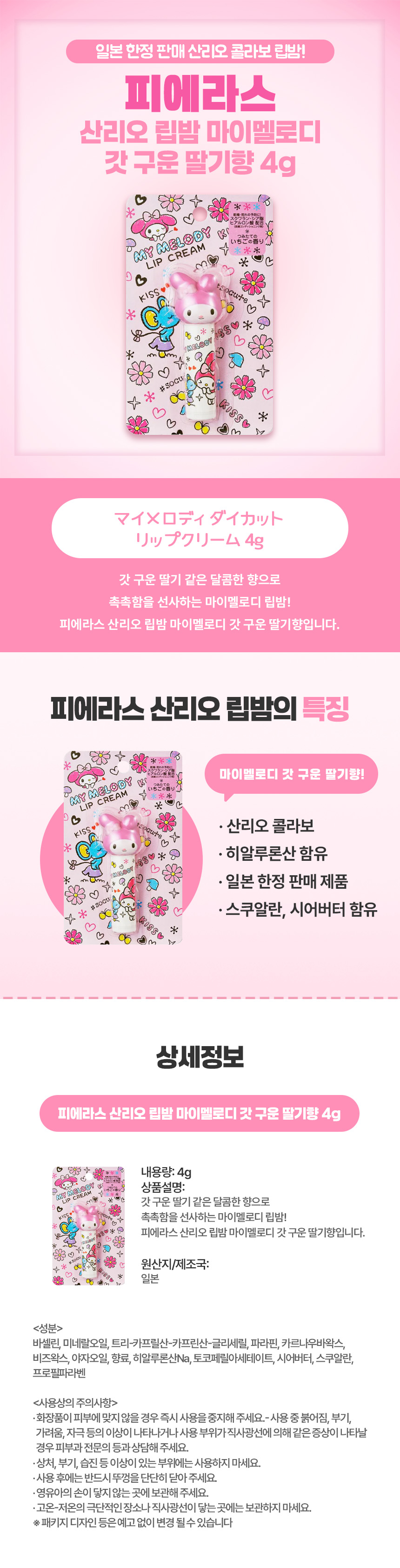 피에라스 산리오 립밤 마이멜로디 갓 구운 딸기향 4g