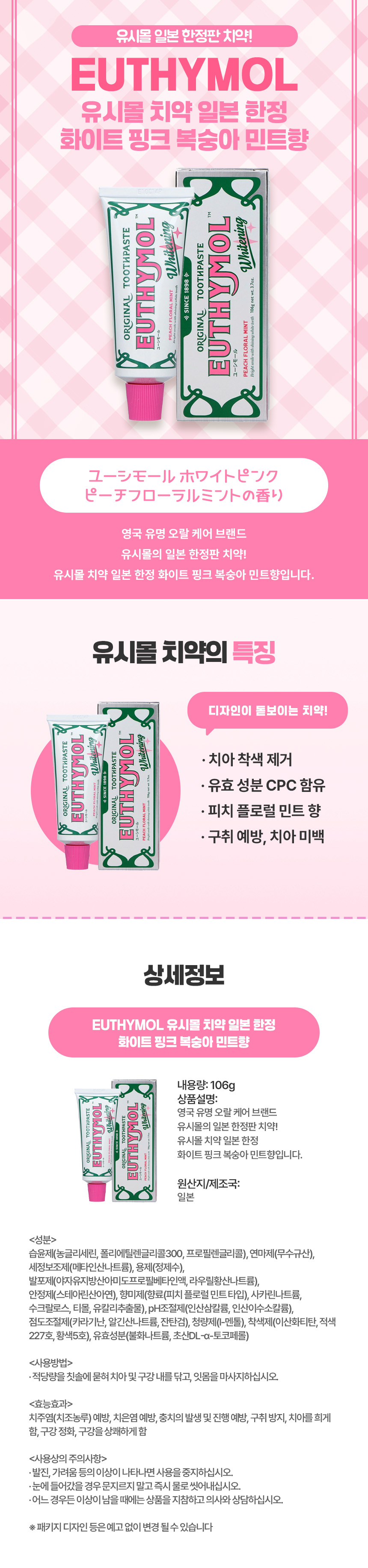 EUTHYMOL 유시몰 치약 일본 한정 화이트 핑크 복숭아 민트향