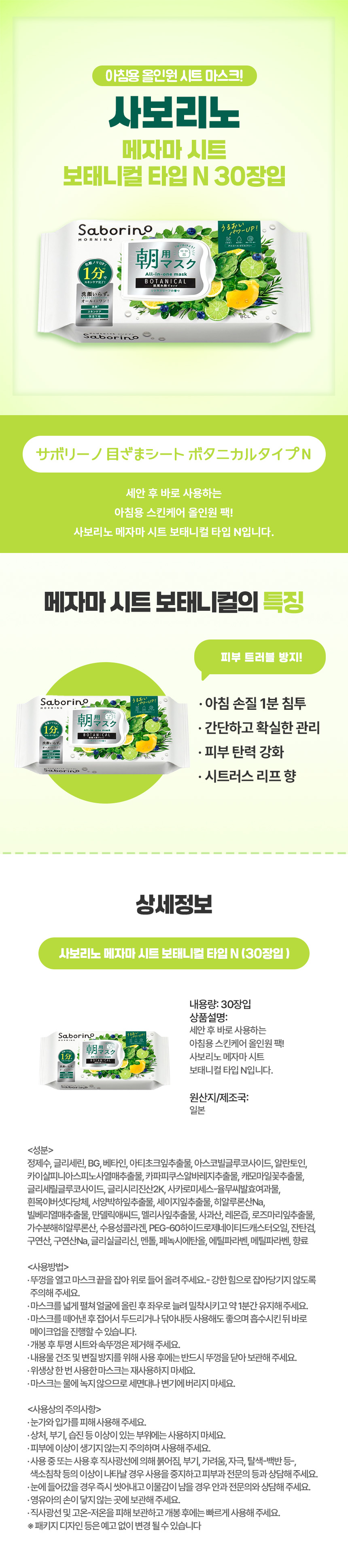 자연 유래 성분으로 순하게 아침 케어를 시작하고 싶을 때 좋은 시트팩, 일본 직구 사보리노 메자마 시트 보태니컬 타입