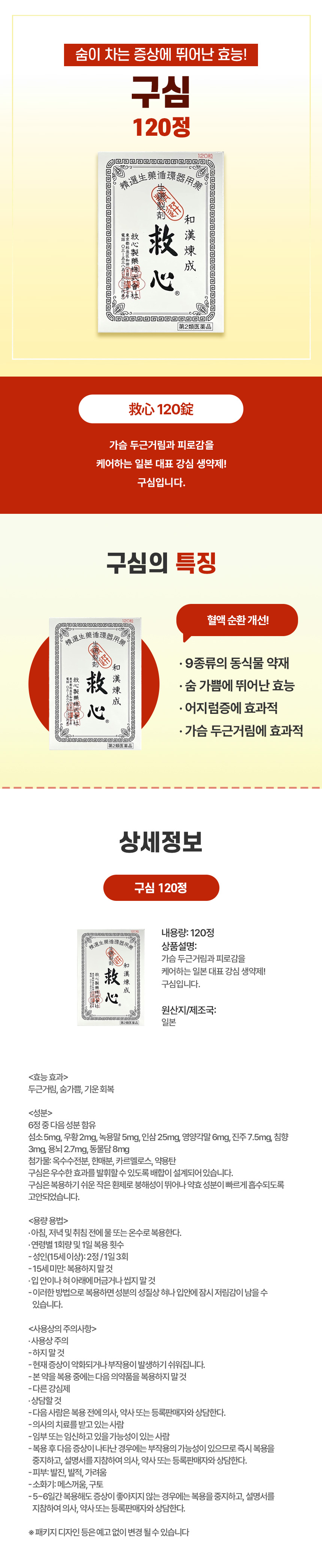 구심은 엄선된 생약 성분을 배합하여 심장 기능을 돕고 혈액 순환을 원활하게 하는 대표적인 강심제입니다. 현대인의 스트레스나 피로로 인해 발생하는 가슴 두근거림, 숨 가쁨 증상을 완화하는 데 탁월하며, 체력 저하 시 전신의 기력을 보강하고 혈액 공급을 도와 현기증이나 어지럼증 개선에 도움을 줍니다. 특히 자연 유래 성분인 섬수, 우황, 녹용 등이 포함되어 있어 신체의 자정 능력을 높여줍니다.