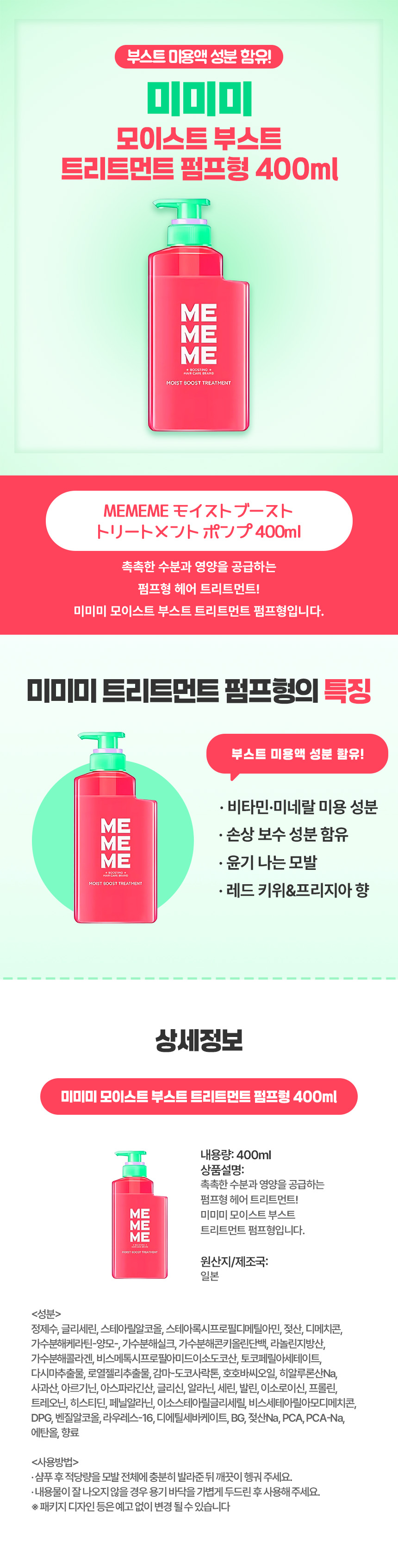 미미미 모이스트 부스트 트리트먼트는 건조하고 푸석해진 모발에 즉각적인 수분을 공급하여 실크처럼 부드러운 머릿결을 선사하는 프리미엄 홈케어 제품입니다. 고농축 하이드롤라이즈드 단백질이 모발 큐티클 사이를 촘촘하게 메워 끊어짐을 방지하고 탄력을 높여줍니다. 천연 유래 오일 성분이 모발 표면에 수분 보호막을 형성하여 장시간 촉촉함을 유지하며, 열기구 사용으로 손상된 모발의 윤기를 되찾아줍니다. 400ml 대용량과 편리한 펌프형 용기로 매일매일 체계적인 보습 관리가 가능합니다.