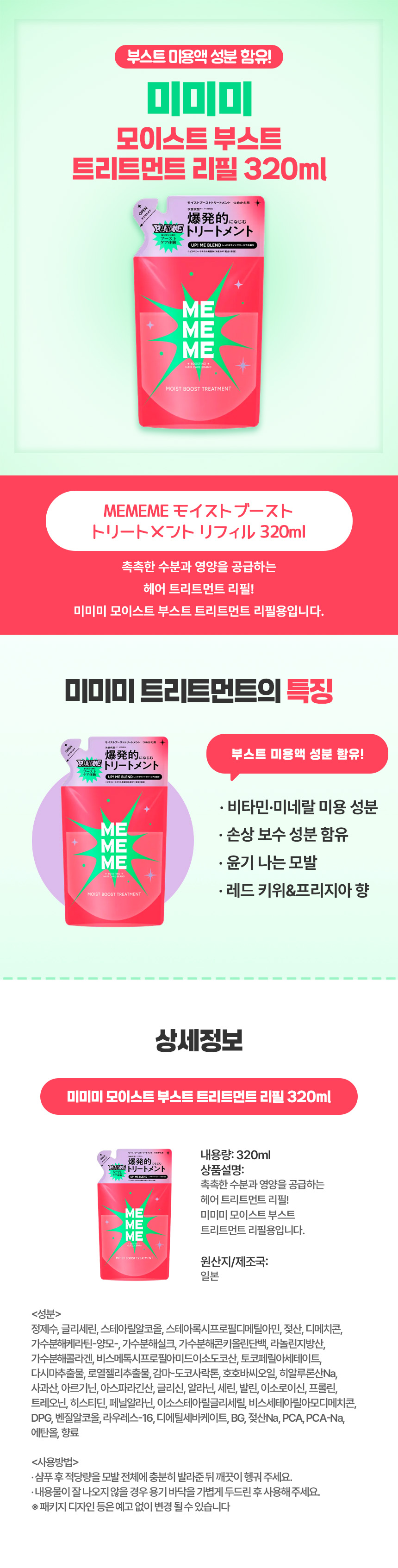 수분 베이스의 가벼운 제형으로 매일 사용해도 모발이 처지거나 떡지는 현상 없이 산뜻한 마무감을 줍니다.