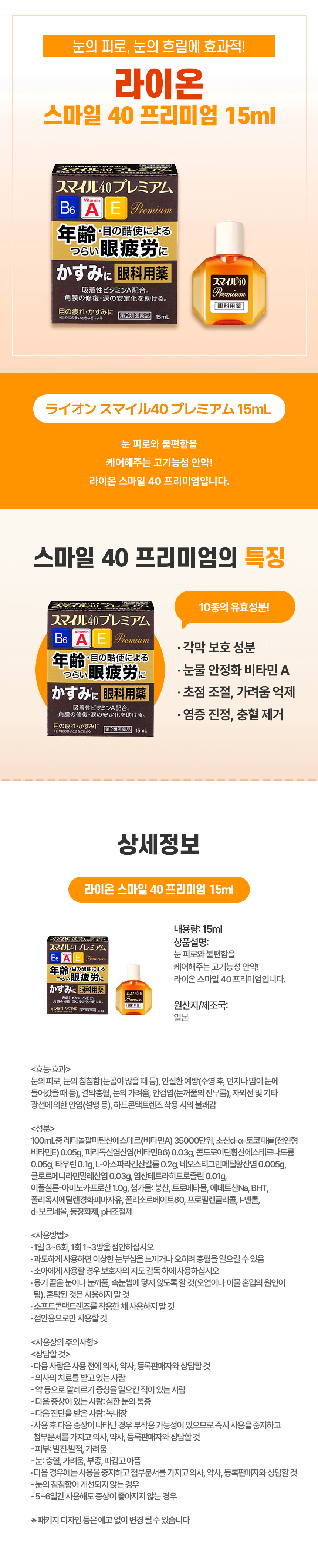 라이온 스마일 40 프리미엄은 비타민 A 35,000단위를 포함하여 총 10가지 유효 성분이 배합된 고기능성 안약입니다. 각막의 복구와 눈물의 안정을 돕는 비타민 A는 물론, 비타민 E와 B6가 세포의 신진대사를 촉진하여 눈의 피로와 침침함을 근본적으로 개선합니다. 특히 네오스티그민메틸황산염 성분이 초점 조절 기능을 회복시켜주며 가려움과 충혈을 억제하는 성분이 포함되어 있어 일상생활에서 겪는 다양한 안구 불편함을 종합적으로 케어해주는 프리미엄 솔루션입니다.