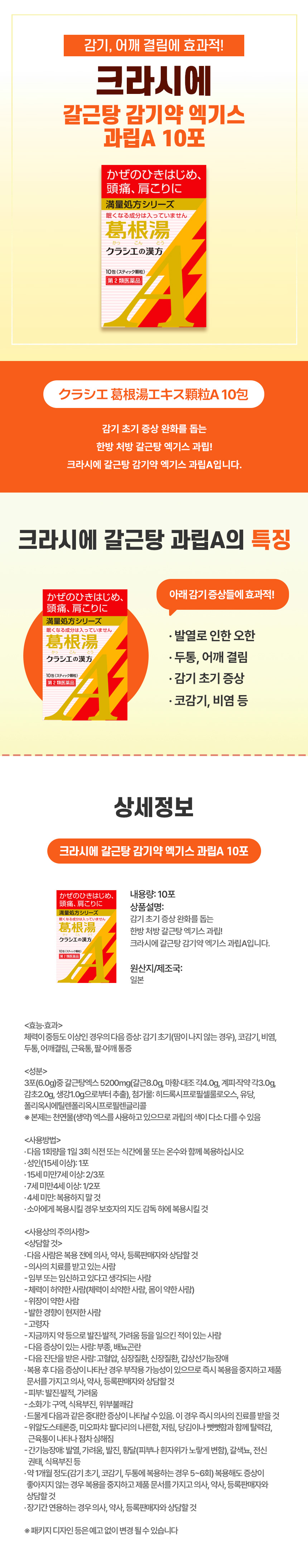 오한과 발열, 두통 등 감기 초기에 나타나는 증상을 완화하는 일본 한방 갈근탕 과립 타입 의약품입니다.